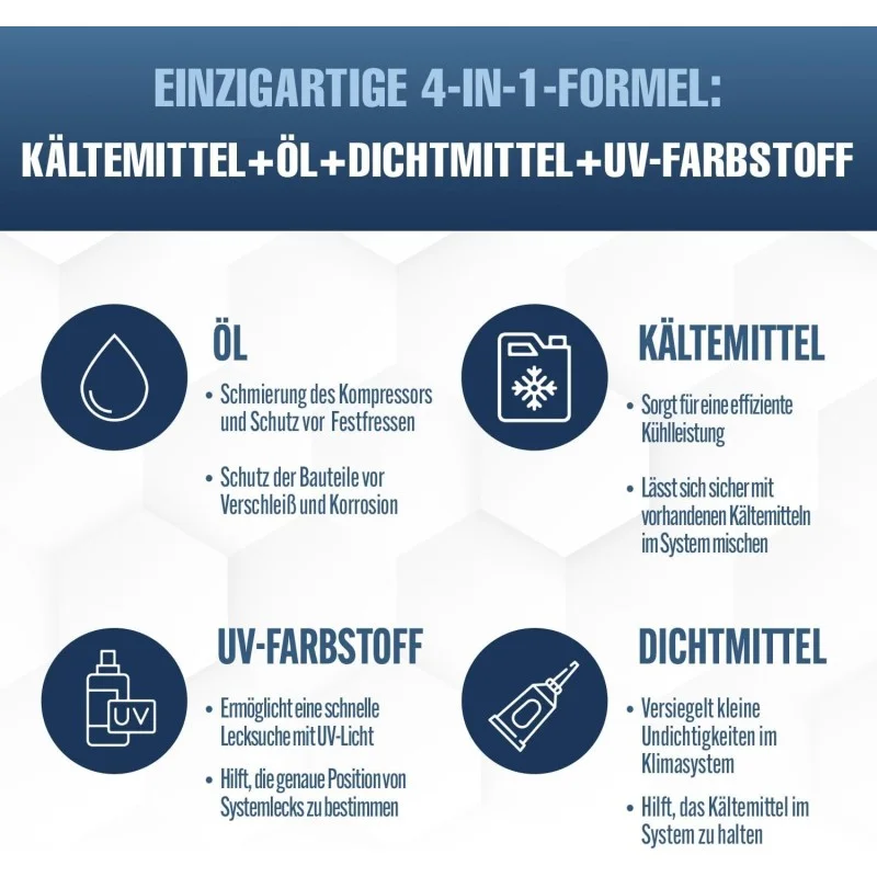 Dieses Set ist die ideale DIY-Lösung für alle, die ihre Klimaanlage nicht nur befüllen, sondern auch auf Undichtigkeiten prüfen möchten. Dank der Kombination aus Kältemittelersatzgas, Dichtmittel und UV-Farbstoff sparen Sie Zeit und vermeiden unnötige Werkstattkosten.