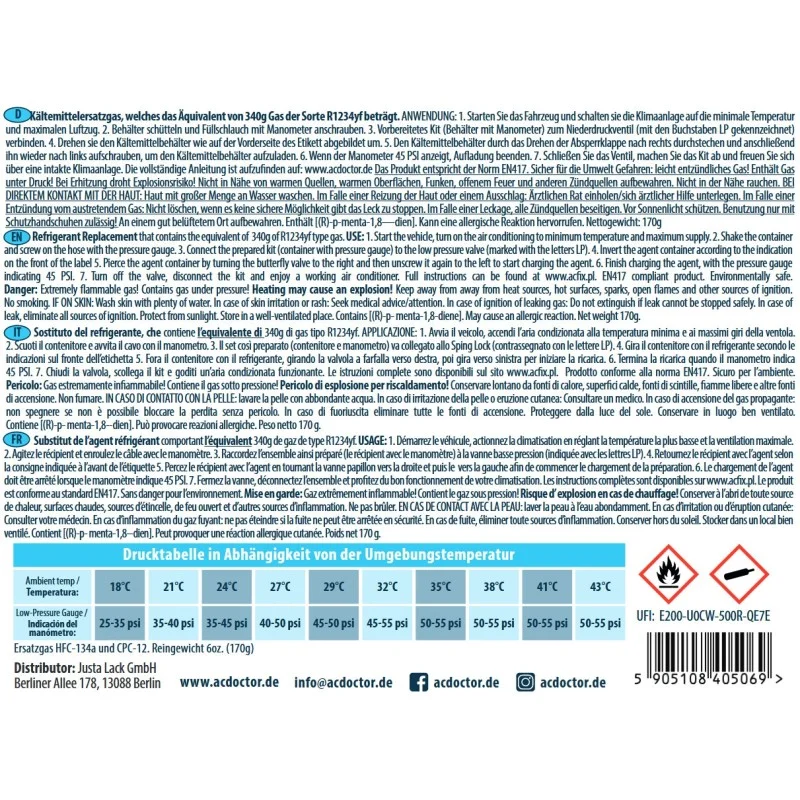 A/C Doctor Klimagas ist ein Kältemittel der neuen Generation, das das Kältemittel R-1234yf ersetzt, welches für Klimaanlagen in Autos ab 2017 verwendet wurde.